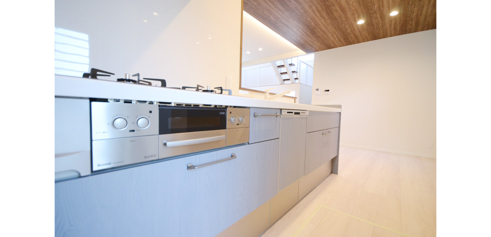 ブルーグレーオーク色のキッチンがアクセントとなり上品でおしゃれなLDK。